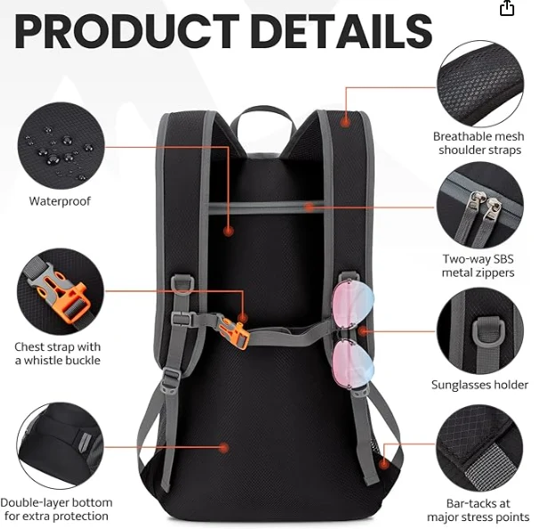 Veekindel matkav kokkupandav seljakott, vile pandlaga rindkereklamber töötab suurepäraselt paki raskuse jaotamiseks ja püsivas ja keskpunktiks. Peab olema sport, matkamine ja Campingzhejiang Jiayu Outdoor Products Co., Ltd. Nähtavuse suurendamine öise õues toimuvate tegevuste ajal. See disain tagab, et jääte teistele nähtavaks, suurendades ohutust, kui olete pimedas väljas